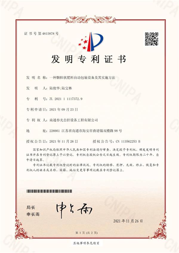 一種顆粒狀肥料自動包裝設備及其實施辦法發明專利證書
